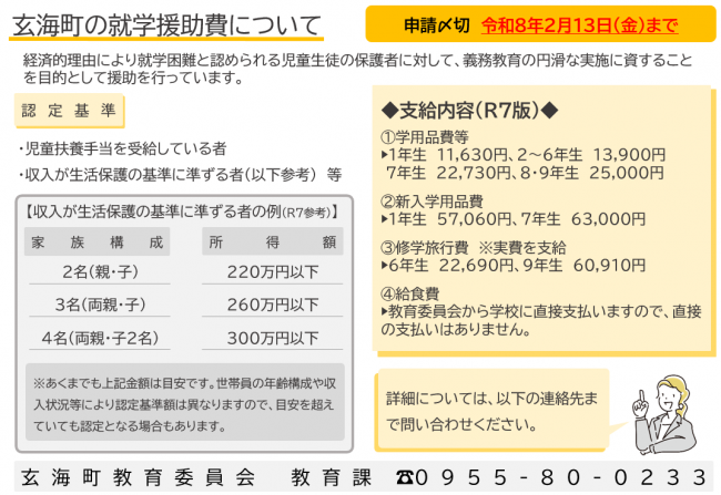 玄海町では、経済的理由により就学困難と認められる児童生徒の保護者に対して、義務教育の円滑な実施に役立てることを目的として就学援助の支援を行っております。